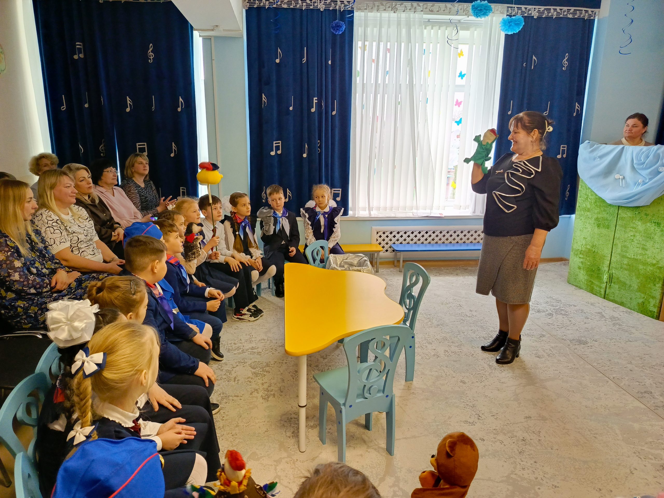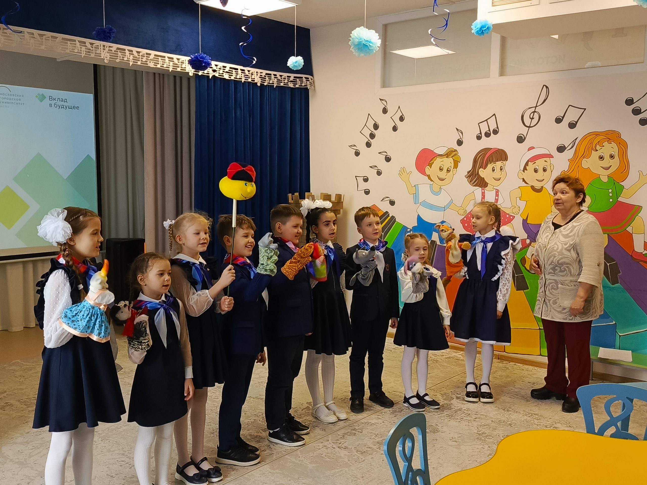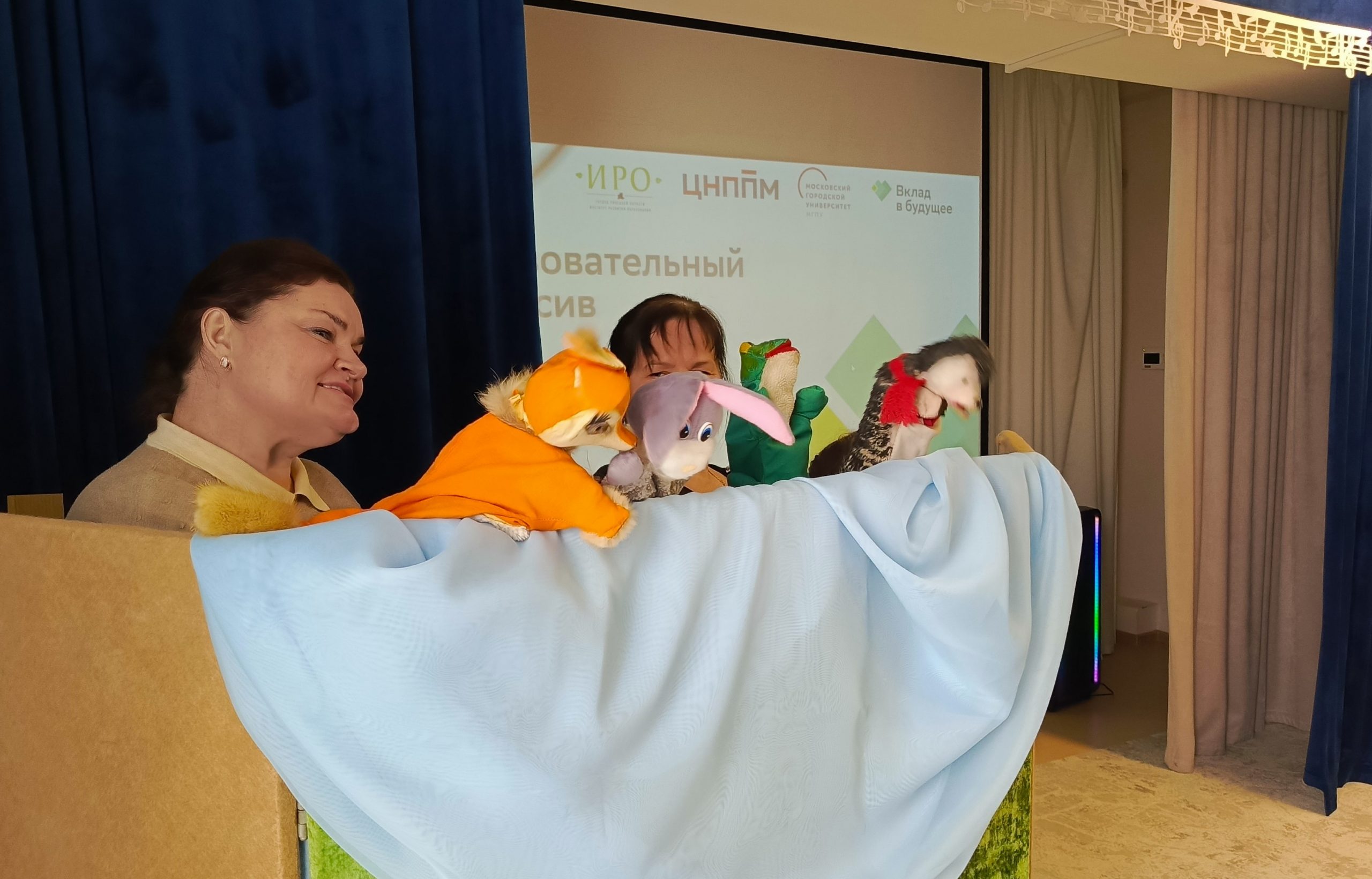 Для младших школьников педагоги-участники интенсива провели занятие «Волшебная перчатка», посвященное знакомству с перчаточными куклами. Под руководством наставников дети осваивали алгоритм «оживления» кукол: надевание, пробуждение, приветствие, зрительный контакт, движение. Особое внимание уделялось индивидуальному сопровождению, что позволило каждому ребенку успешно овладеть первичными навыками управления куклой.